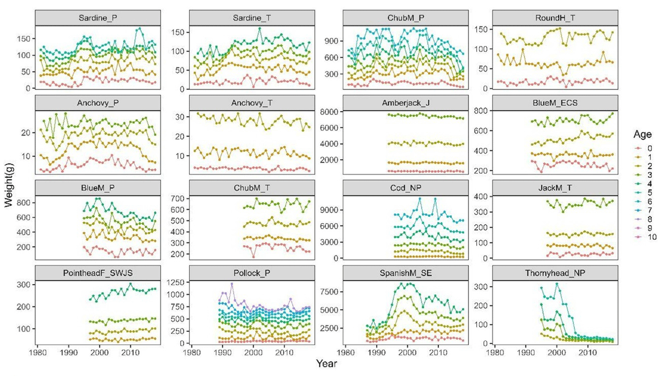 元データは水産庁および水産研究・教育機構が公表している資源評価報告書に記載されている年齢別体重(https://abchan.fra.go.jp/hyouka/