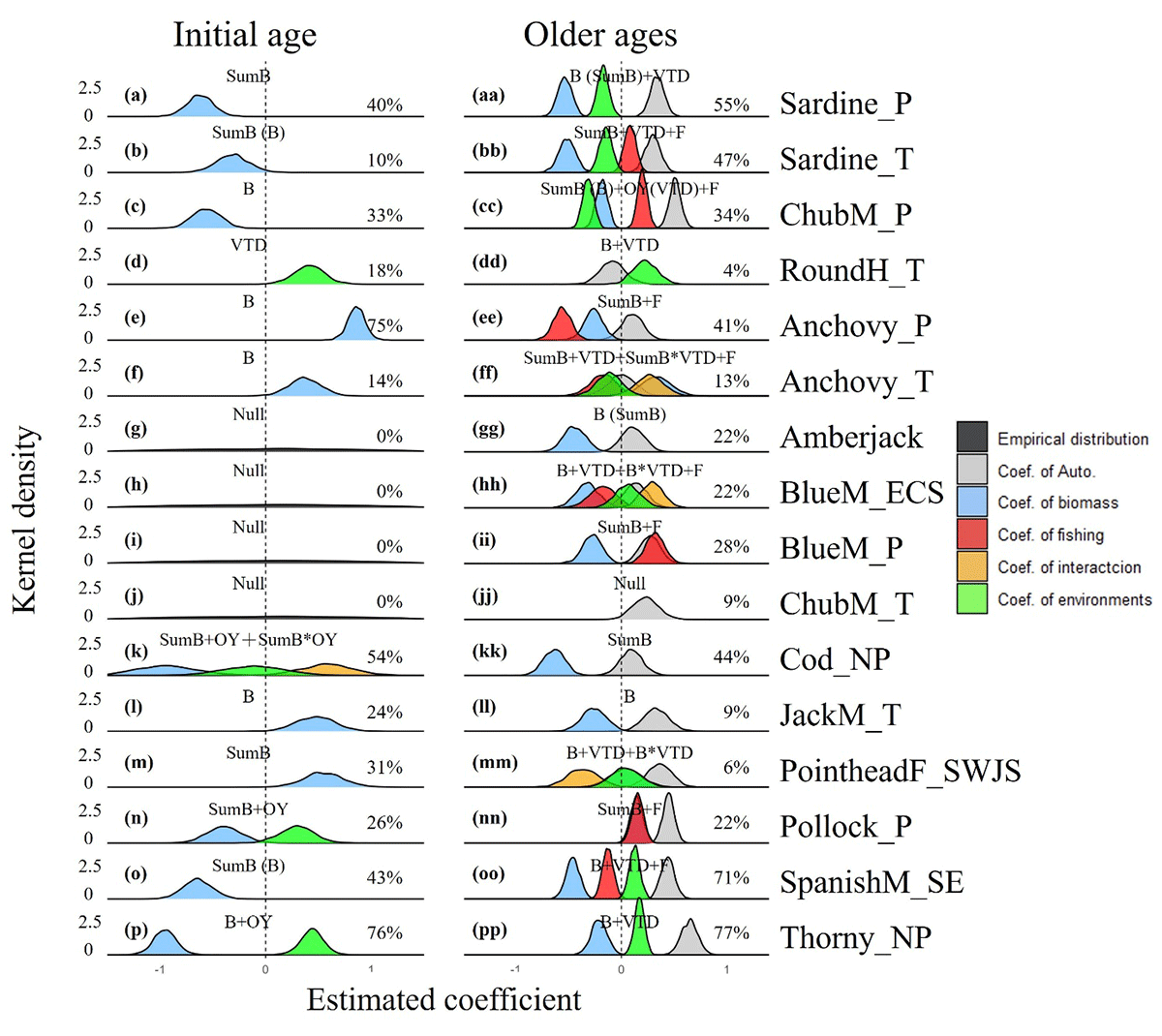 左列は最小年齢の解析結果、右列はそれ以降の年齢の解析結果。それぞれの色は体重変動の要因を示し、点線の0の値から離れてかつ高いピークを示すものほど影響が明確であることを示す(灰色:過去の履歴の影響、水色:魚種内及び魚種間競争、赤:漁獲圧、橙:交互作用、緑:環境要因)。Bは種内競争、SumBはマイワシ・マサバ・カタクチイワシからの種間競争、OYは親潮面積、VTDは表層と下層の水温差の影響を示す。Nullはどの影響でも説明できなかったことを示す。右側の%はモデルの説明率を示す。系群については(注1)参照。Lin et al. (2025)より(CC-BY)。